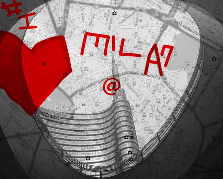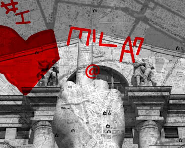 In questo progetto di grafica digitale, gli scatti simbolici di Milano fanno da sfondo sulla mappa della città.